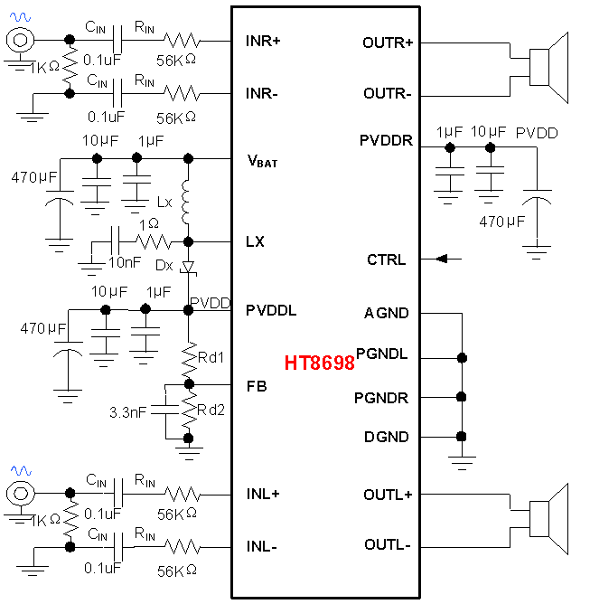 HT8698內部集成免濾波器數字調制技術(shù),能夠直接驅動(dòng)揚聲器,并最大程度減小脈沖輸出信號的失真和噪音。輸出無(wú)需濾波網(wǎng)絡(luò ),極少的外部元器件節省了系統空間和成本,是便攜式應用的理想選擇。