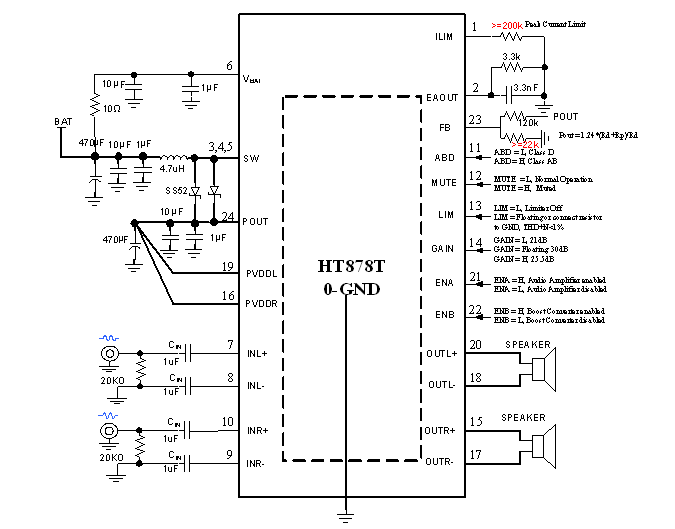 11 | ABD | I | Audio amplifier mode selection. Class D is selected when it is pulled low; Class AB is selected when it is pulled high. 音頻功放模式選擇端。接地時(shí)為D類(lèi)模式,接高時(shí)為AB類(lèi)模式。 |