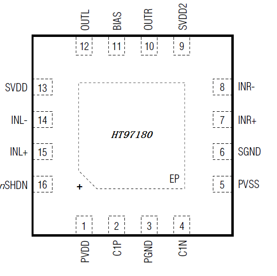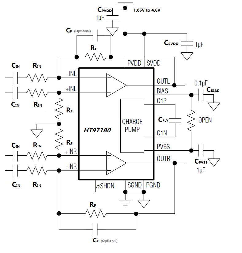HT97180為差分輸入、可直接輸出的耳機放大器。4.2V供電時(shí),器件為32Ω耳機負載提供125mW驅動(dòng)。IC可以通過(guò)外部電阻調整增益。