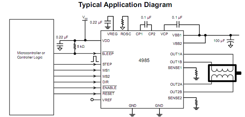 譯碼器是HR4985易于實(shí)施的關(guān)鍵。通過(guò)STEP簡(jiǎn)單的輸入一個(gè)脈沖就可以使電機完成一次步進(jìn),省去了相序表,高頻控制線(xiàn)及復雜的編程接口。這使其更適于在沒(méi)有復雜的微處理器或微處理器負擔過(guò)重的場(chǎng)合。
