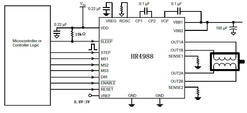 譯碼器是HR4988易于實(shí)施的關(guān)鍵。通過(guò)STEP簡(jiǎn)單的輸入一個(gè)脈沖就可以使電機完成一次步進(jìn),省去了相序表,高頻控制線(xiàn)及復雜的編程接口。這使其更適于在沒(méi)有復雜的微處理器或微處理器負擔過(guò)重的場(chǎng)合。