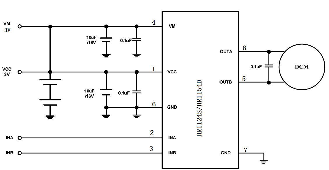 HR1124S/HR1154D是應用于直流電機方案的單通道H橋驅動(dòng)器芯片。HR1124S/HR1154D的H橋驅動(dòng)部分采用低導通電阻的PMOS和NMOS功率管。低導通電阻保證芯片低的功率損耗,使得芯片安全工作更長(cháng)時(shí)間。此外HR1124S/HR1154D擁有低待機電流、低靜態(tài)工作電流。這些性能使能HR1124S/HR1154D易用于玩具方案。